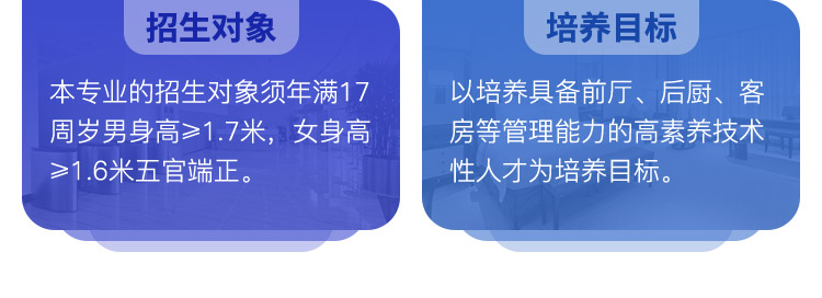 本校酒店管理专业学制为2.5+0.5年(2.5年在校学习,0.5年顶岗实习),就业方向包括大型酒店、连锁企业和知名餐饮企业。新东方酒店管理专业学生不仅拥有精湛的烹饪技能,还有较强的管理知识,一直是用人单位很受欢迎的人才。